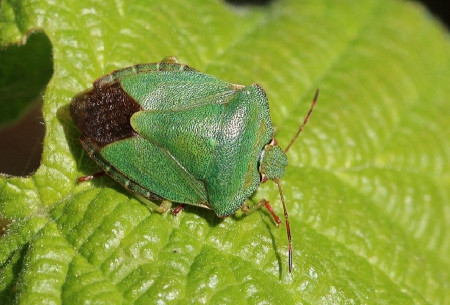 Green shield bugs are small, bright green insects. The adults look like beetles. They have sucking mouthparts and a shield-like body [1].