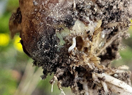 Affected plants wilt and turn yellow. The bulbs may also become soft and rot.